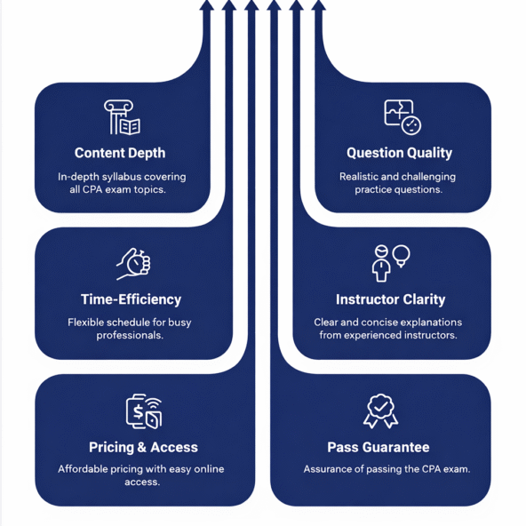 We evaluated each course using the following criteria, based on what actually impacts CPA outcomes and long-term success with the best CPA exam review courses:
