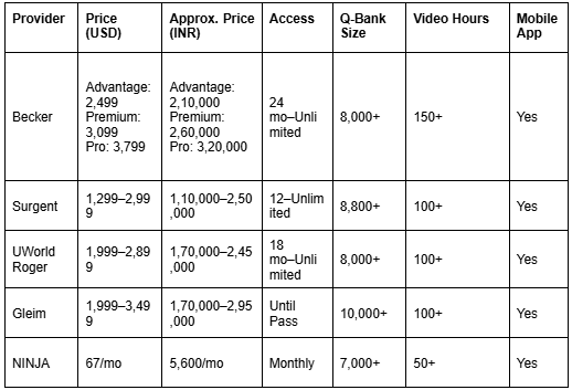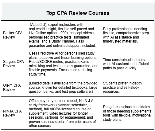 Here is a comparison chart covering pricing, access duration, and core learning features of popular CPA review courses on both international platforms as well as India-centric options.